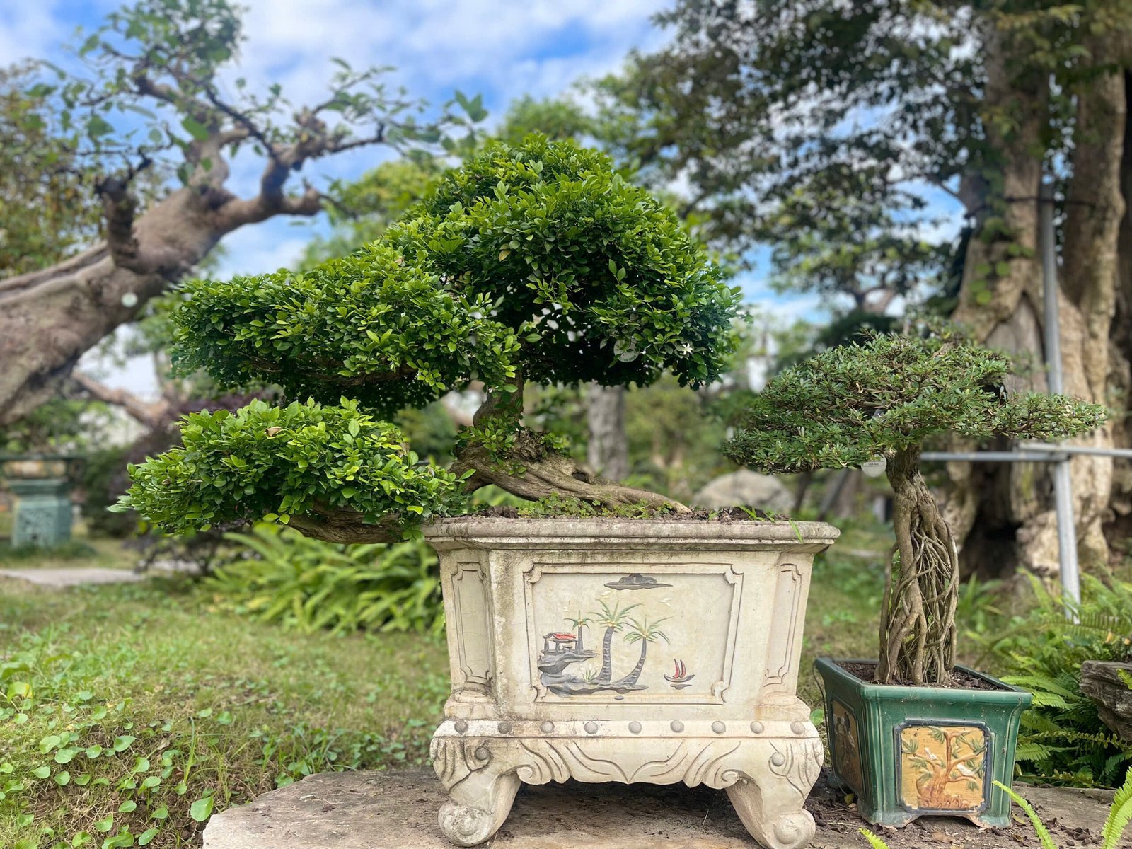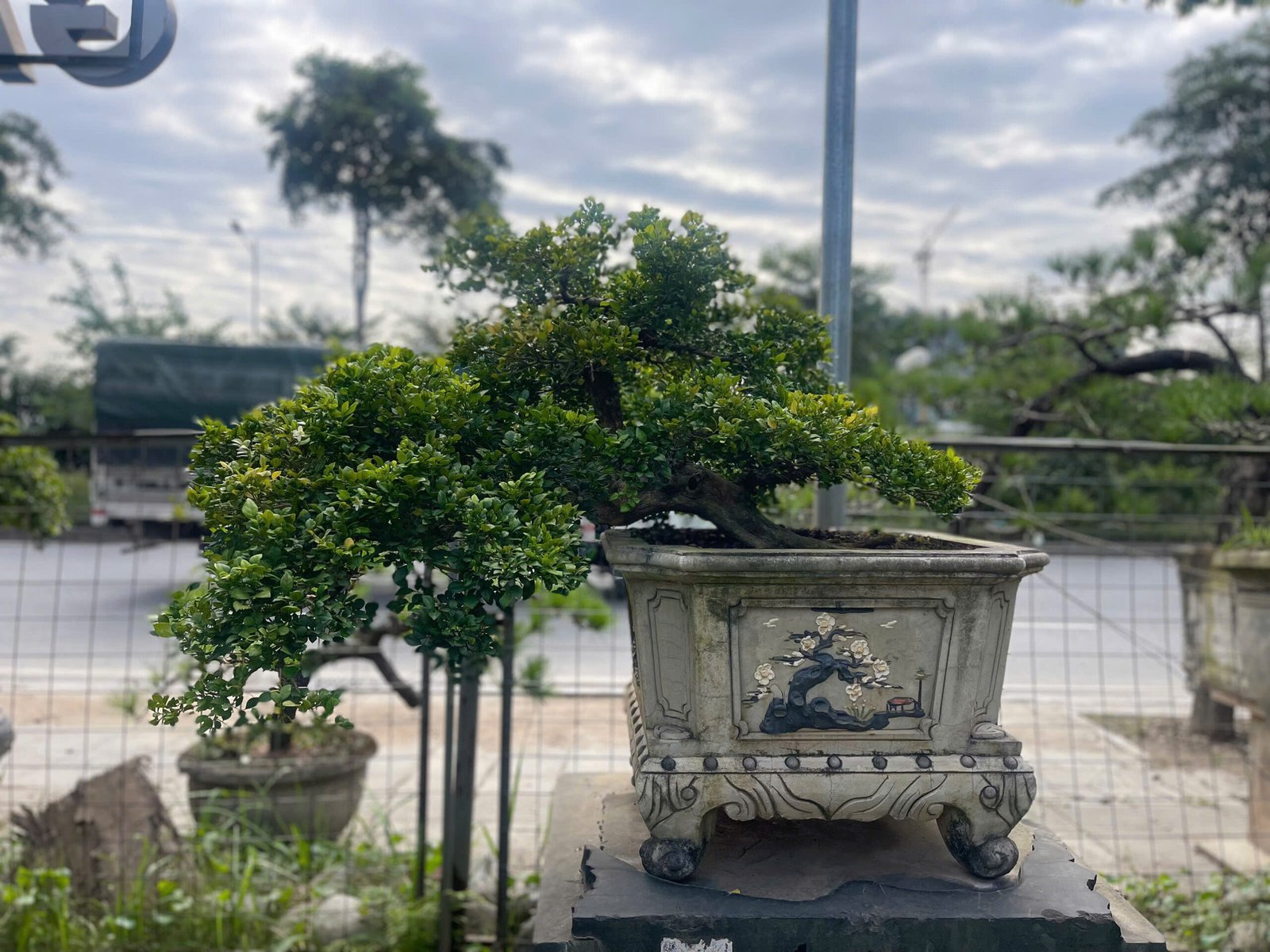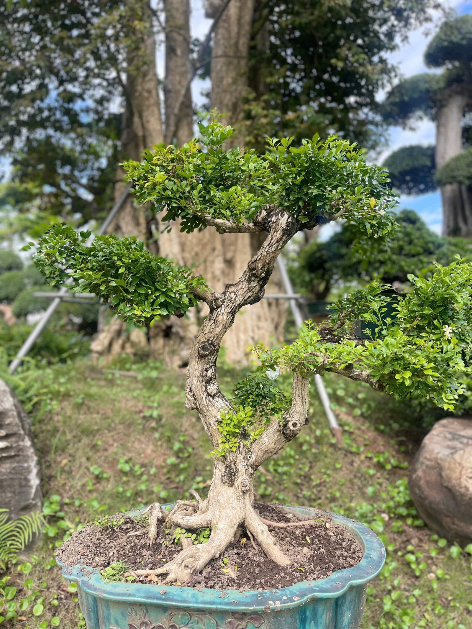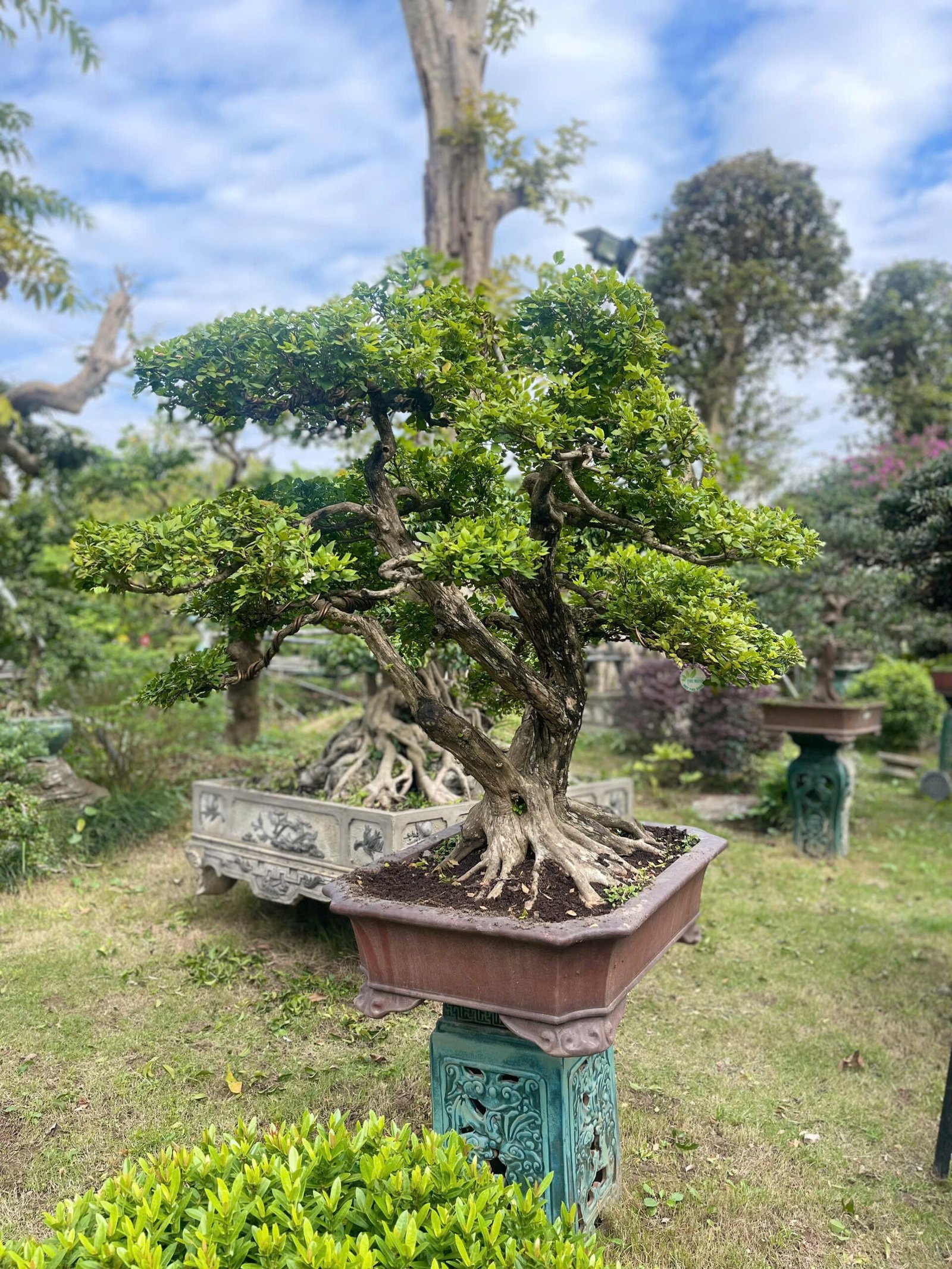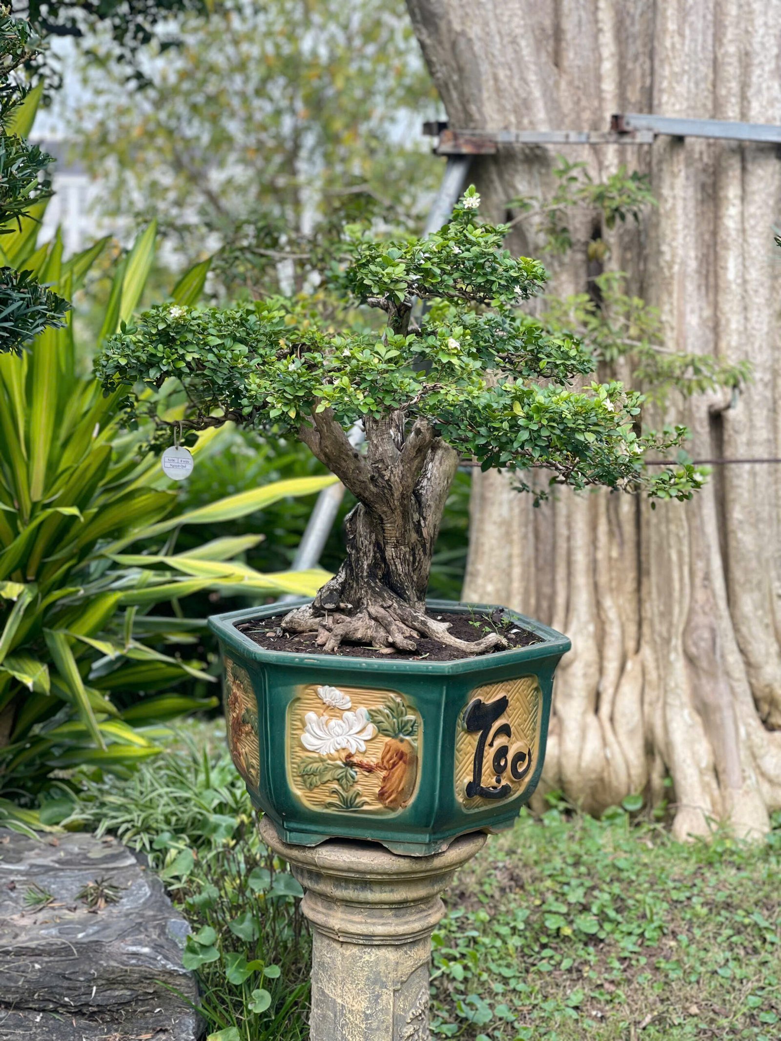 Cây bonsai cảnh: Những cây nguyệt quế lá nhỏ, thân gân guốc được tạo dáng công phu, đặt ở tiền sảnh hoặc bàn trà.